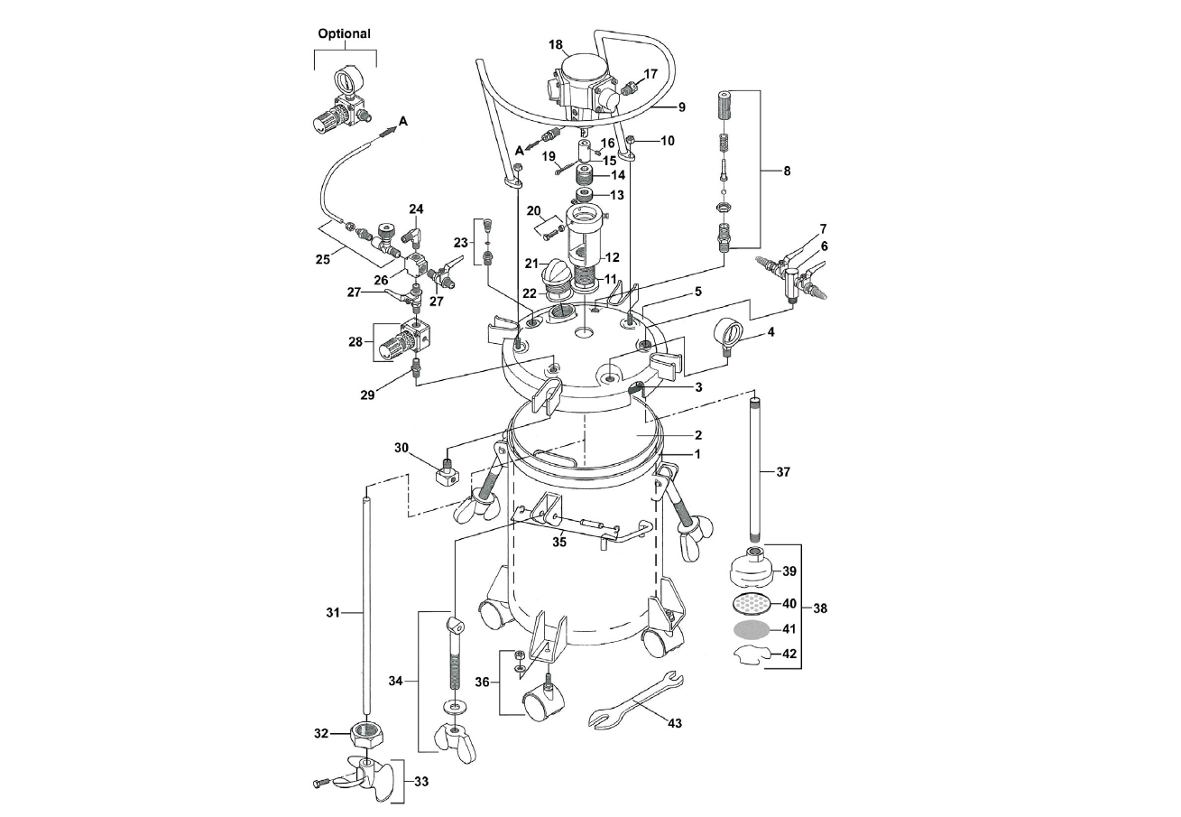 Note: This is a 12.5 gallon stainless steel non-ASME air agitated pressure tank. Use the parts list below to match item numbers to replacement parts.