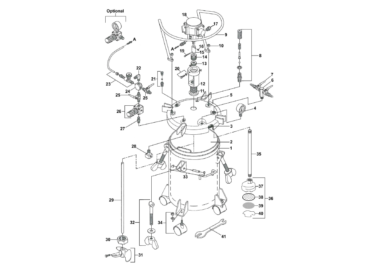Note: This is an all-stainless 5 gallon tank with air powered agitation. Use the parts list below to match item numbers to replacement parts.
