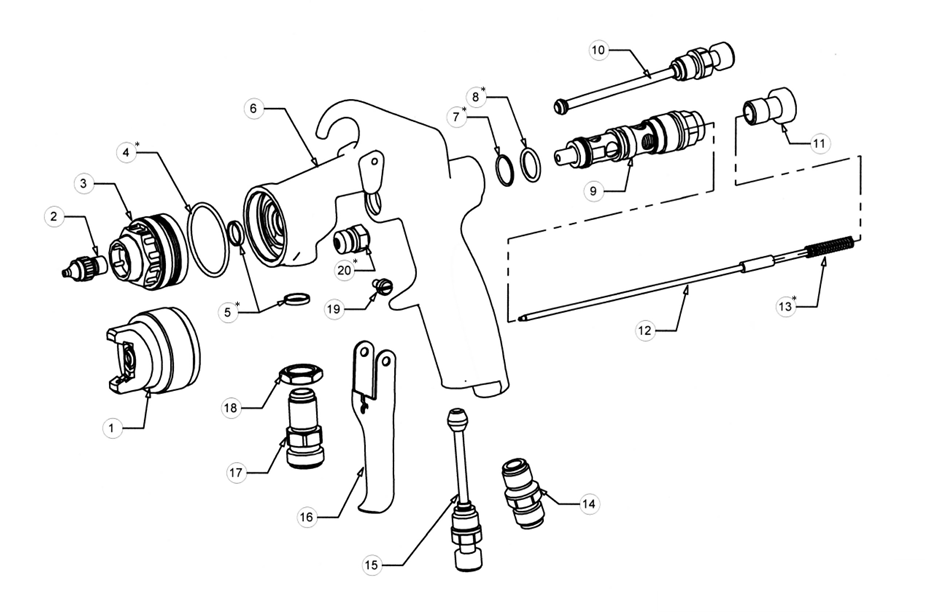 If you're unsure which air cap, fluid tip, or replacement part you need for your FE-Line Fine Finish spray gun, contact CET with your model configuration and item number from the diagram. We'll help confirm compatibility before you order.