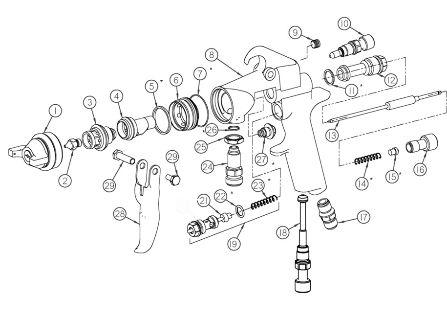 If you're unsure which air cap, fluid nozzle, or replacement part you need for your Lynx 100C spray gun, contact CET with your model configuration and item number from the diagram. We'll help confirm compatibility before you order.
